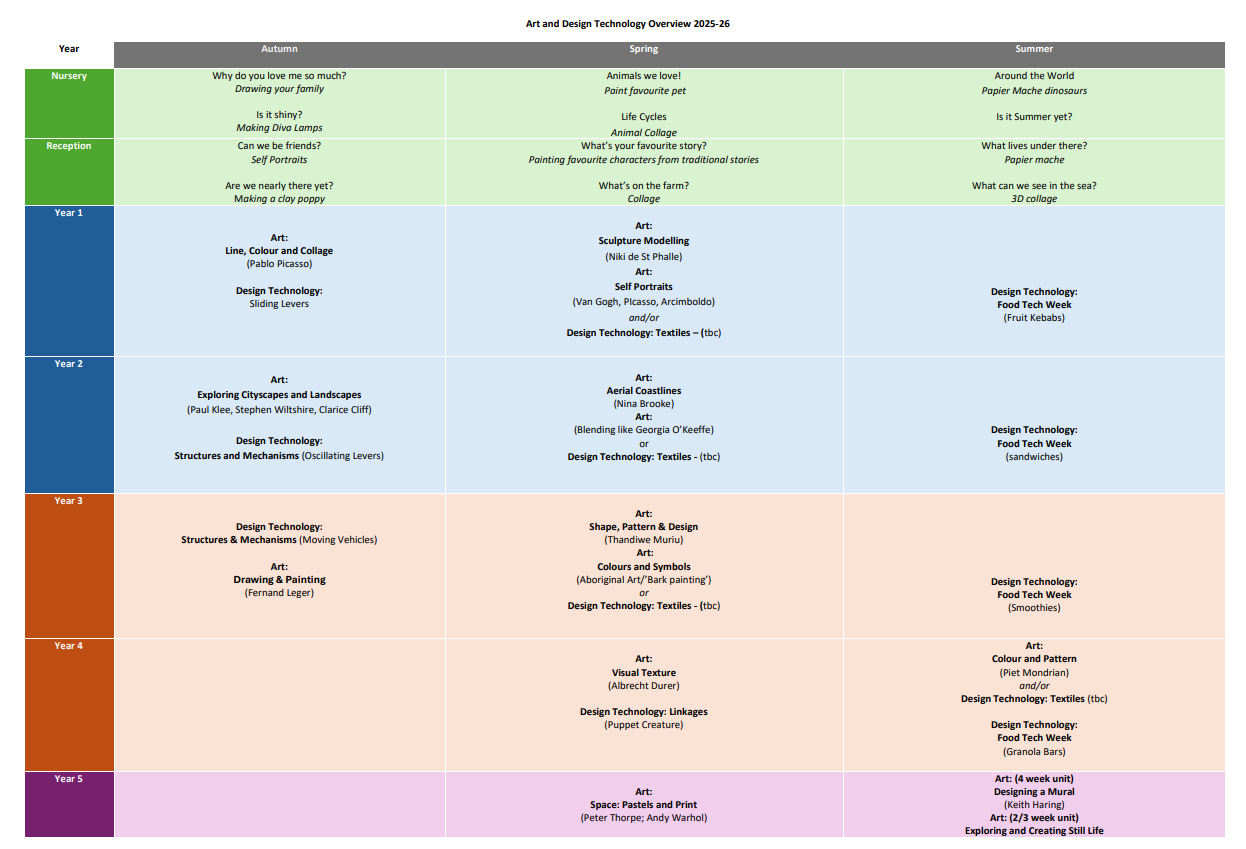 As Picasso once said, ‘every child is an artist’. If children are taught this from an early age, they will grow up with the confidence to use art as a form of expression. Thus, by the end of Year 6, learners will have had memorable experiences, developed more varied ways to express themselves and know how to apply the skills they have learnt on their journey throughout our primary school.