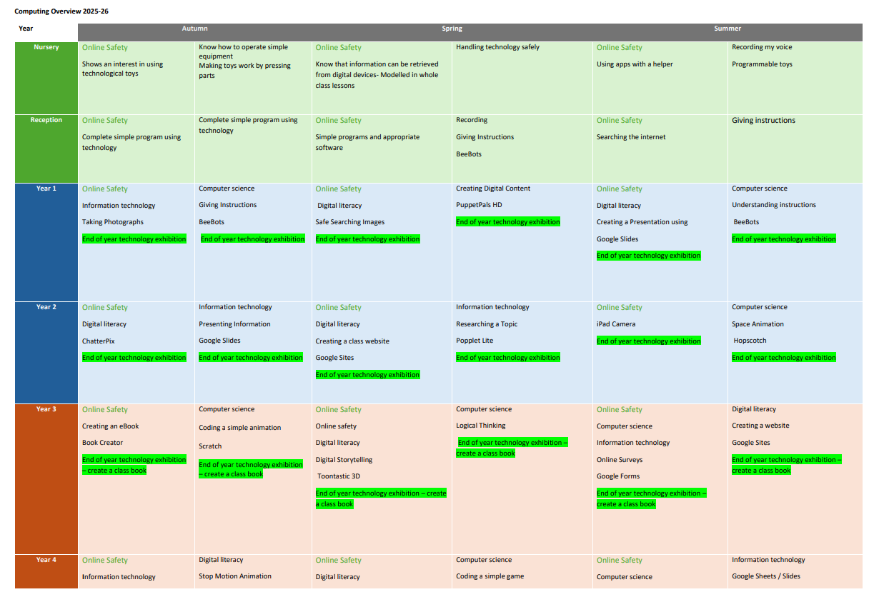 Online Safety is taught half termly through a bespoke progressive curriculum for our school community. A range of technology platforms are used to allow versatility of technology application. We constantly review our practices to maximise the use of the latest technology, applications, systems. Specialist teaching is used for some more technical aspects of the computing curriculum and to support non-specialists subject knowledge.