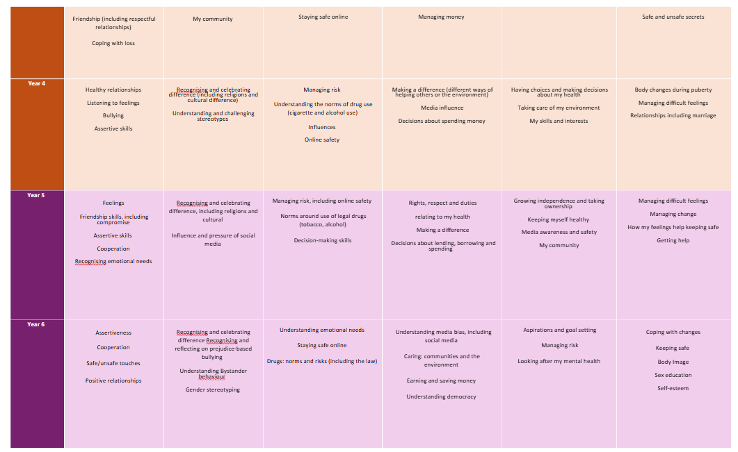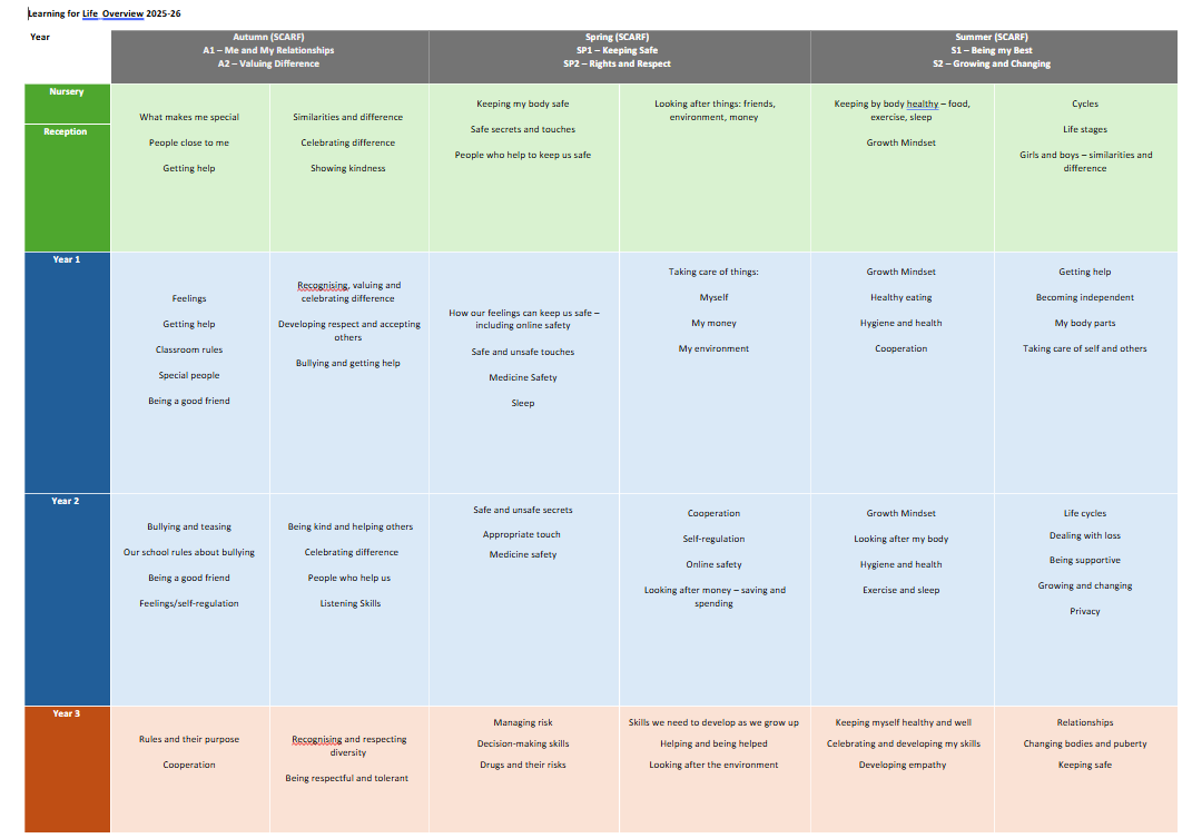 Learning for Life is an ever-evolving subject, which responds to the needs of children and society. In order to achieve this, we have a structured learning experience with a clear balance of skills and knowledge development from EYFS through to Year 6. Our whole school approach involves the following;