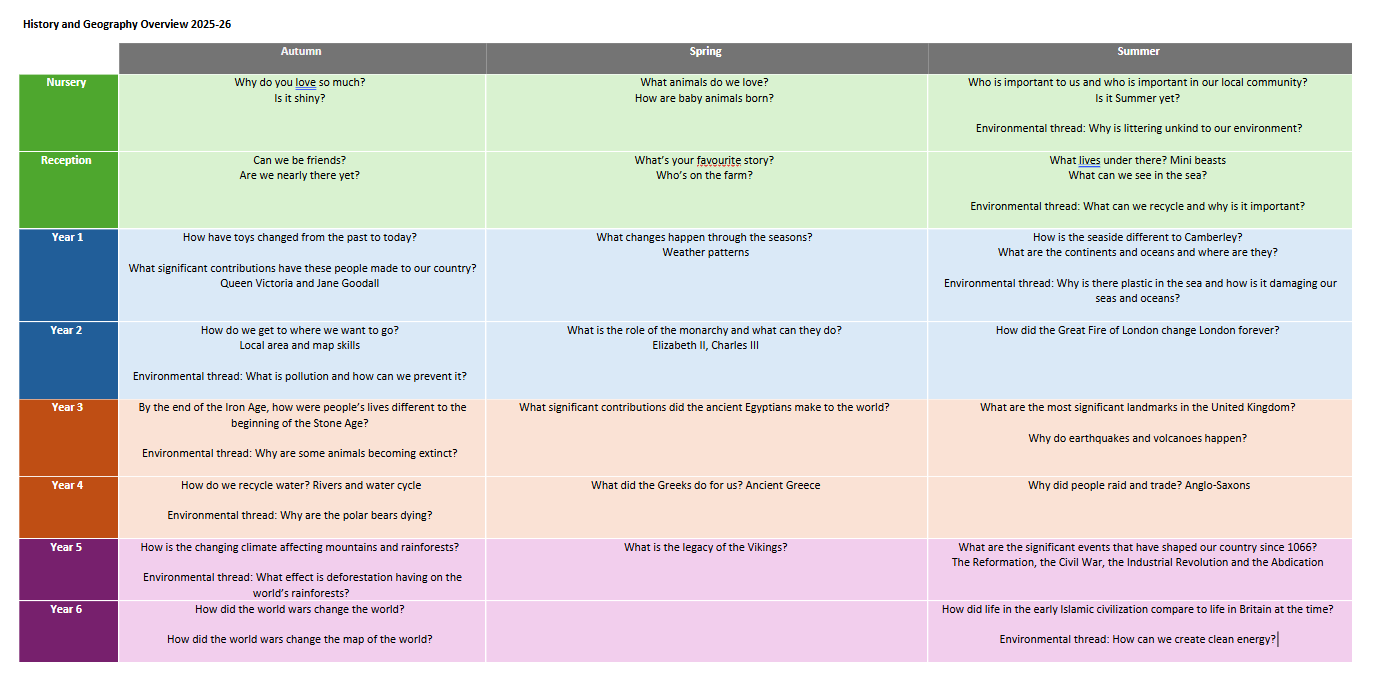 We use a wide range of technology to support us within our Geography sessions. Using iPads, Chrome books, Now Press Play and Virtual Reality headsets gives our pupils an equal learning opportunity and transports them to a range of places around the world to contrast and compare localities. Throughout South Camberley, children are given opportunities to explore their school grounds, local area and wider community where they will learn how to create and follow a variety of route maps and learn how their local area has developed geographically over time. Other exciting learning opportunities include a visit to Kew Gardens which supports the Year 5 topic of Rainforests and Year 1’s trip to Portsmouth to support their knowledge of maps and human and physical features.