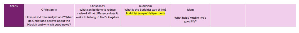 At South Camberley, we teach Religious Education every other half term. During this time, we enrich their understanding through an experience related to the religion we are learning about. These experiences take the form of a visit to a religious building, an in-school visit from a representative of a range of religions, or other memorable learning moment on the first day, e.g. using our school’s VR headsets to visit the Taj Mahal.