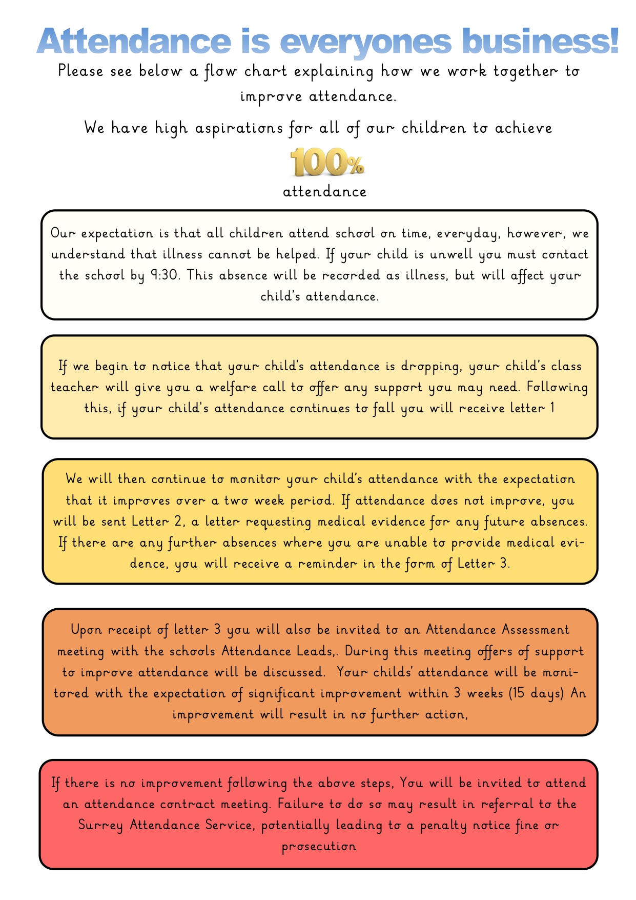 At South Camberley Primary and Nursery School, we are proud to be an inclusive community where every child is encouraged and supported to achieve their very best. Regular attendance gives children the strongest possible start in life, which is why we aim for every child to be in school 100% of the time.